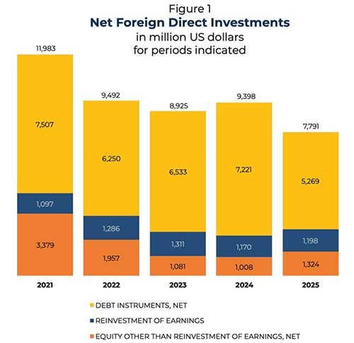 Historically, BSP data showed net FDI inflows stood at USD 11.983 billion in 2021, USD 9.492 billion in 2022, USD 8.925 billion in 2023, USD 9.398 billion in 2024, and USD 7.791 billion in 2025.
