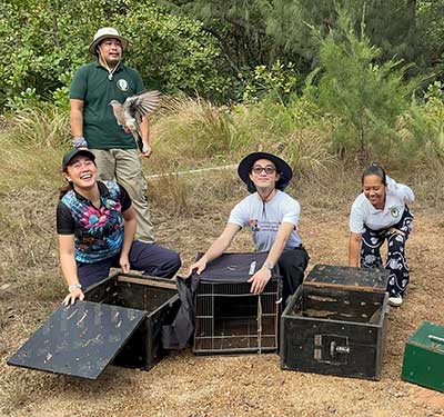 The wildlife released included two adult male white-collared kingfishers (Todiramphus chloris collaris), four adult male spotted doves (Streptopelia chinensis), four adult male common emerald doves (Chalcophaps indica) and four adult male barred rails (Gallirallus torquatus).